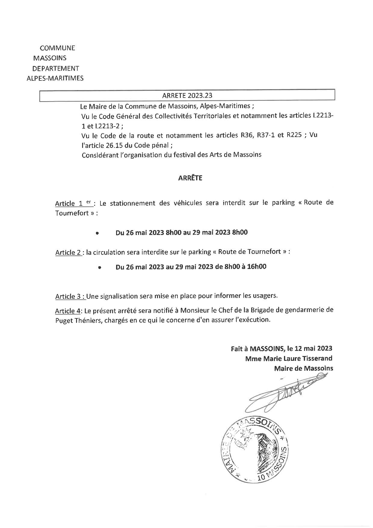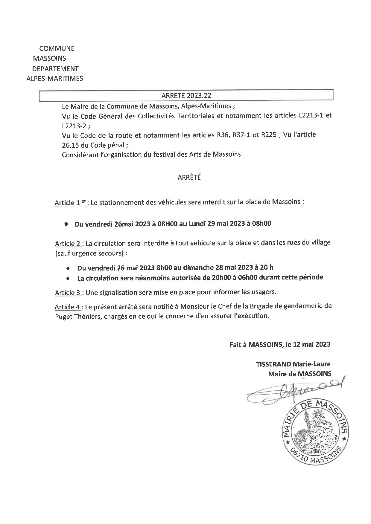 Agenda,Associations,Festival D'Art,Général,La commune,Massoins patrimoineDu 26 au 29 mai : Interdiction de stationner et circuler Publié le 25 mai 202325 mai 2023 par Sylvie COLOMBON A l’occasion du 2ème Festival de Street Art, il sera interdit de stationner et circuler sur la place principale et sur le parking route de Tournefort. Merci de consulter les arrêtés suivants déjà en place sur les panneaux : STATIONNEMENT DURANT LE RALLYE ET LA FETE DES CHASSEURS Journée Bien-être samedi 3 juin 2023