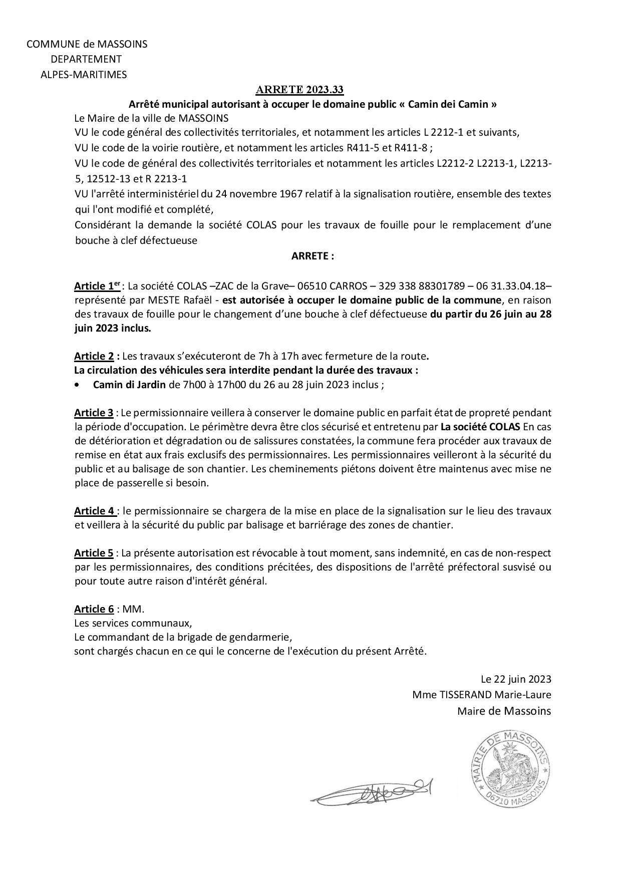 Article 1er : La société COLAS –ZAC de la Grave– 06510 CARROS – 329 338 88301789 – 06 31.33.04.18– représenté par MESTE Rafaël – est autorisée à occuper le domaine public de la commune, en raison de la prolongation des travaux de réfection des pavages des rues du village à partir du lundi 19 juin 2023 et jusqu’au vendredi 8 juillet 2023
