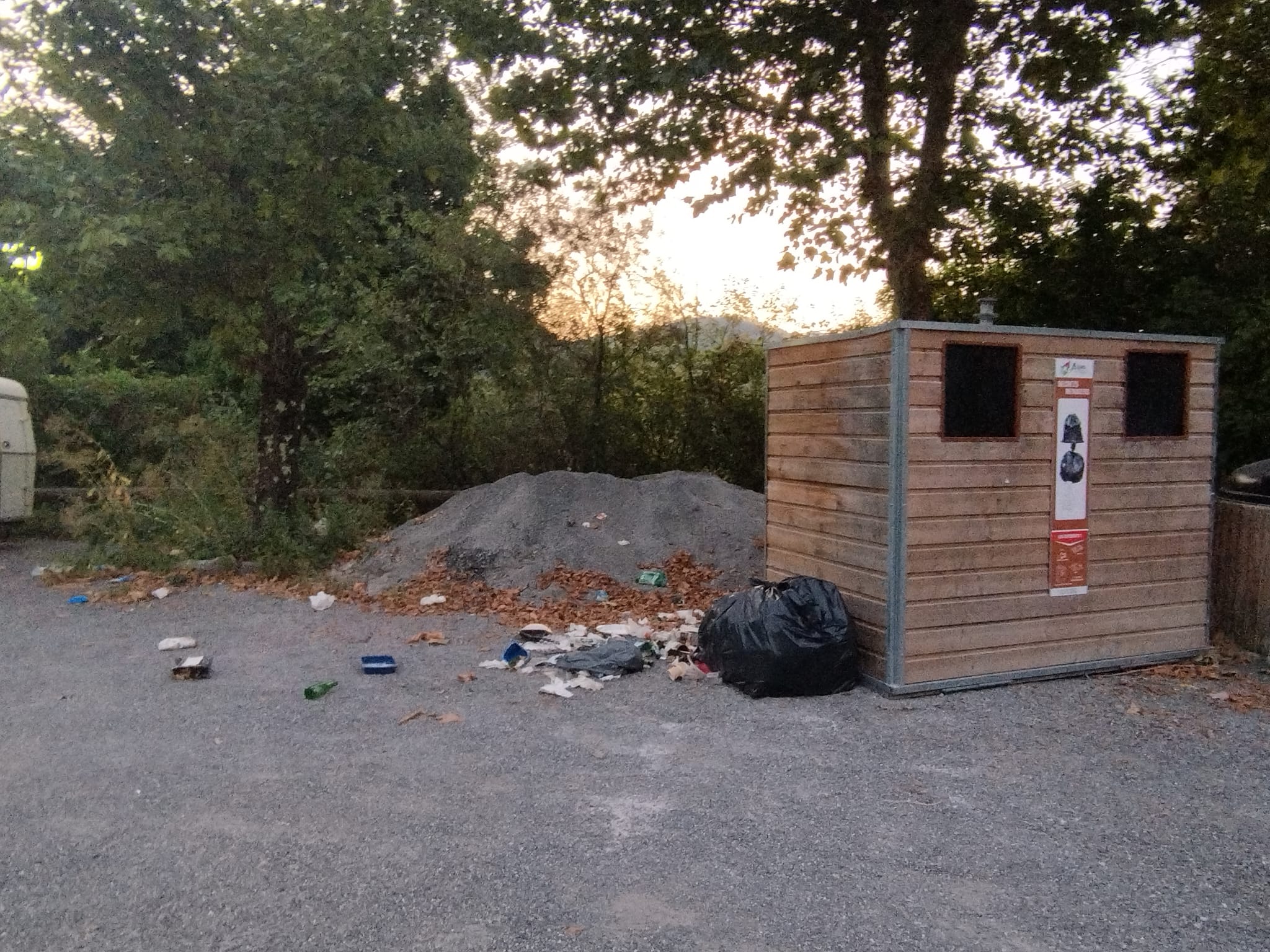 Non seulement les poubelles n’étaient pas triées mais en plus elles n’ont pas été mises dans le container car les sacs étant trop gros ils ont été déposés sur le côté. Ils ont donc été éventrés par les animaux et les détritus dispersés sur le sol.