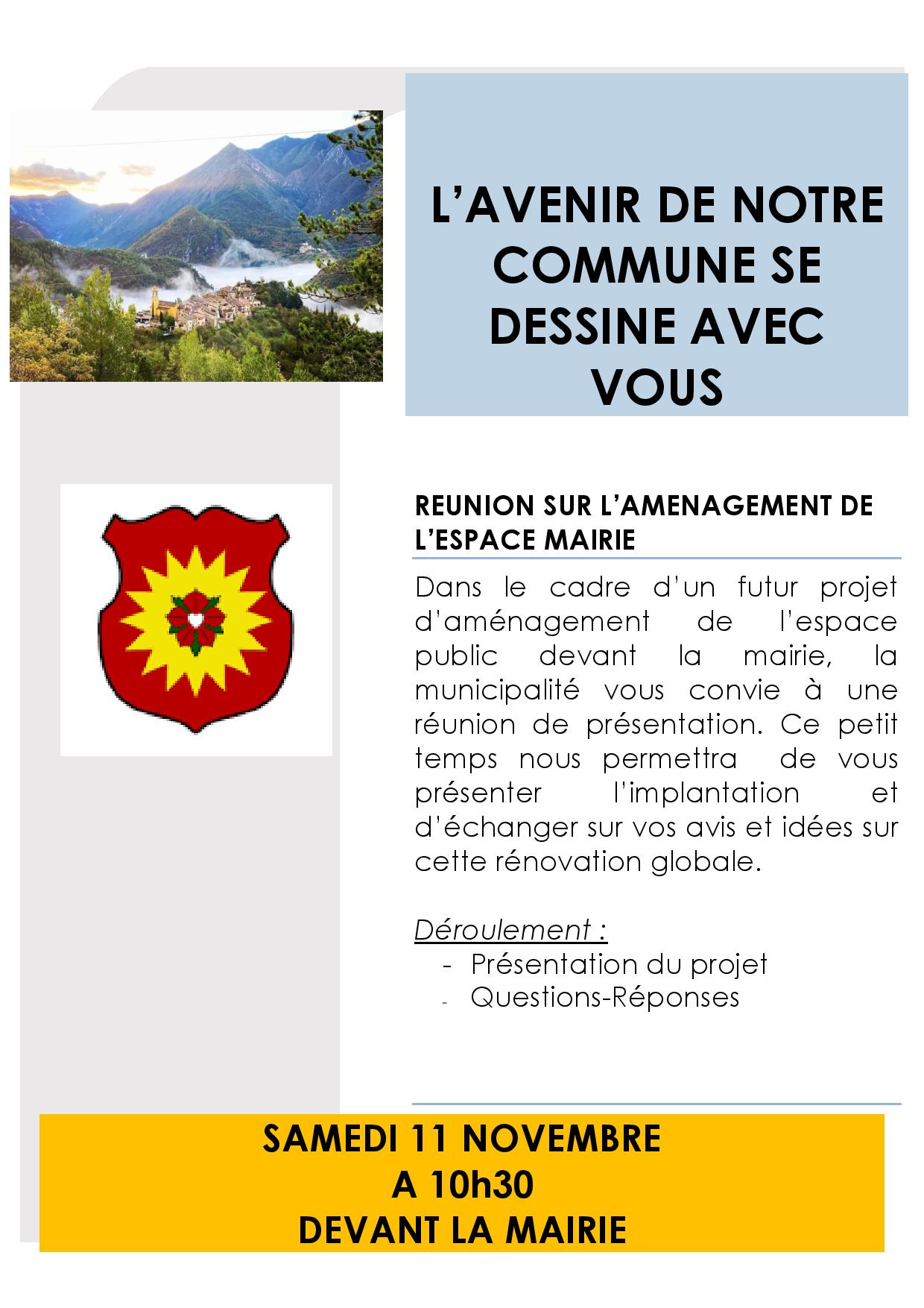 Agenda,CCAS,Général,La communeRéunion de présentation d’un projet d’aménagement devant la Mairie Publié le 9 novembre 20239 novembre 2023 par Sylvie COLOMBON La municipalité vous invite à échanger sur un projet d’aménagement situé aux abords de la mairie et autour du jeu de boules et à 11H30 la 105ème Cérémonie de l’armistice de 1918 Travaux Purge de Falaise Présentation ABC (Atlas Biodiversité Communale) le 17 novembre à 19h