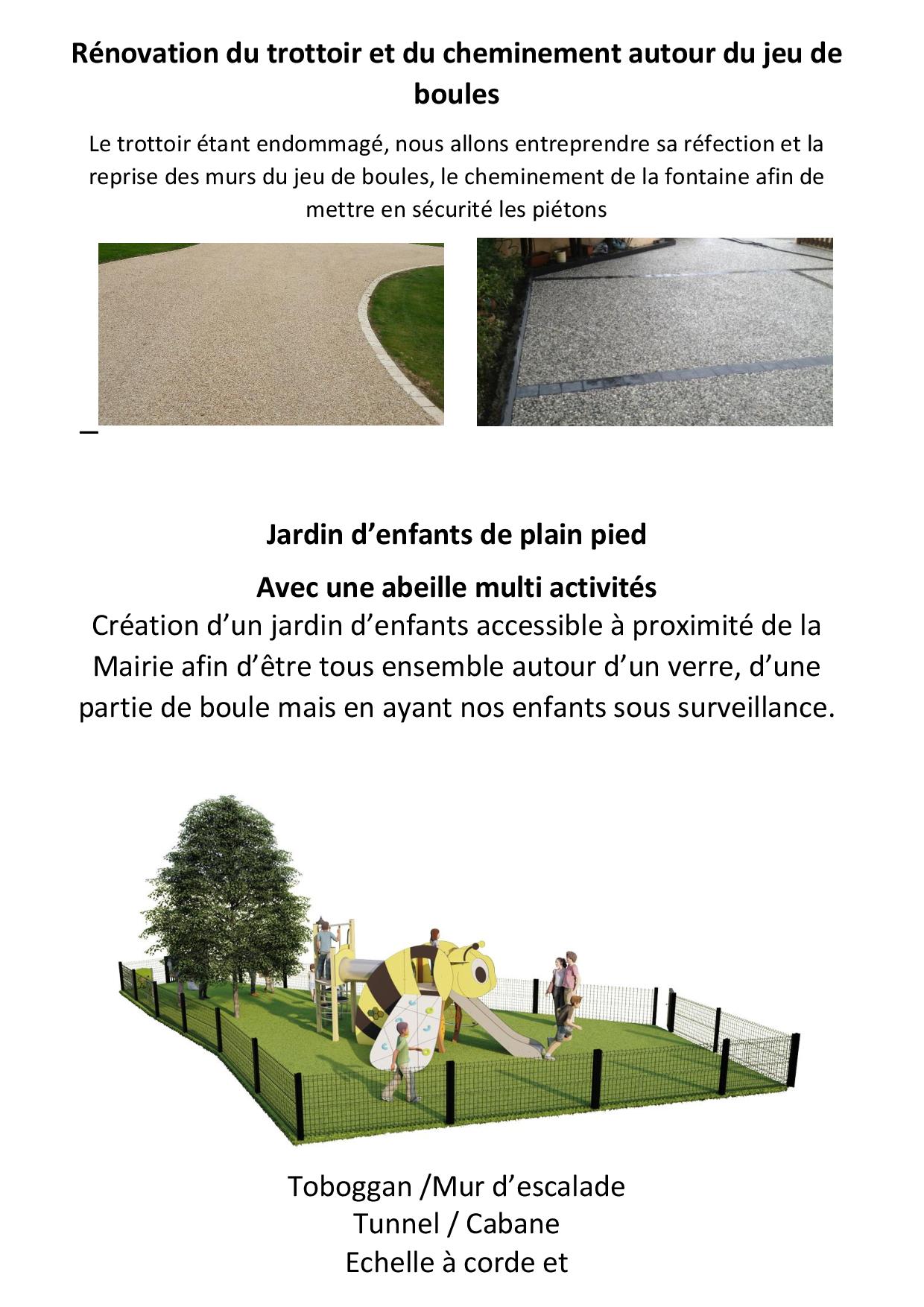 Puis quitte à refaire le cheminement pourquoi ne pas compléter par la rénovation du contour du terrain de boules, permettant d’assurer la sécurité des passants, le confort des spectateurs et la sérénité des parties de pétanque.