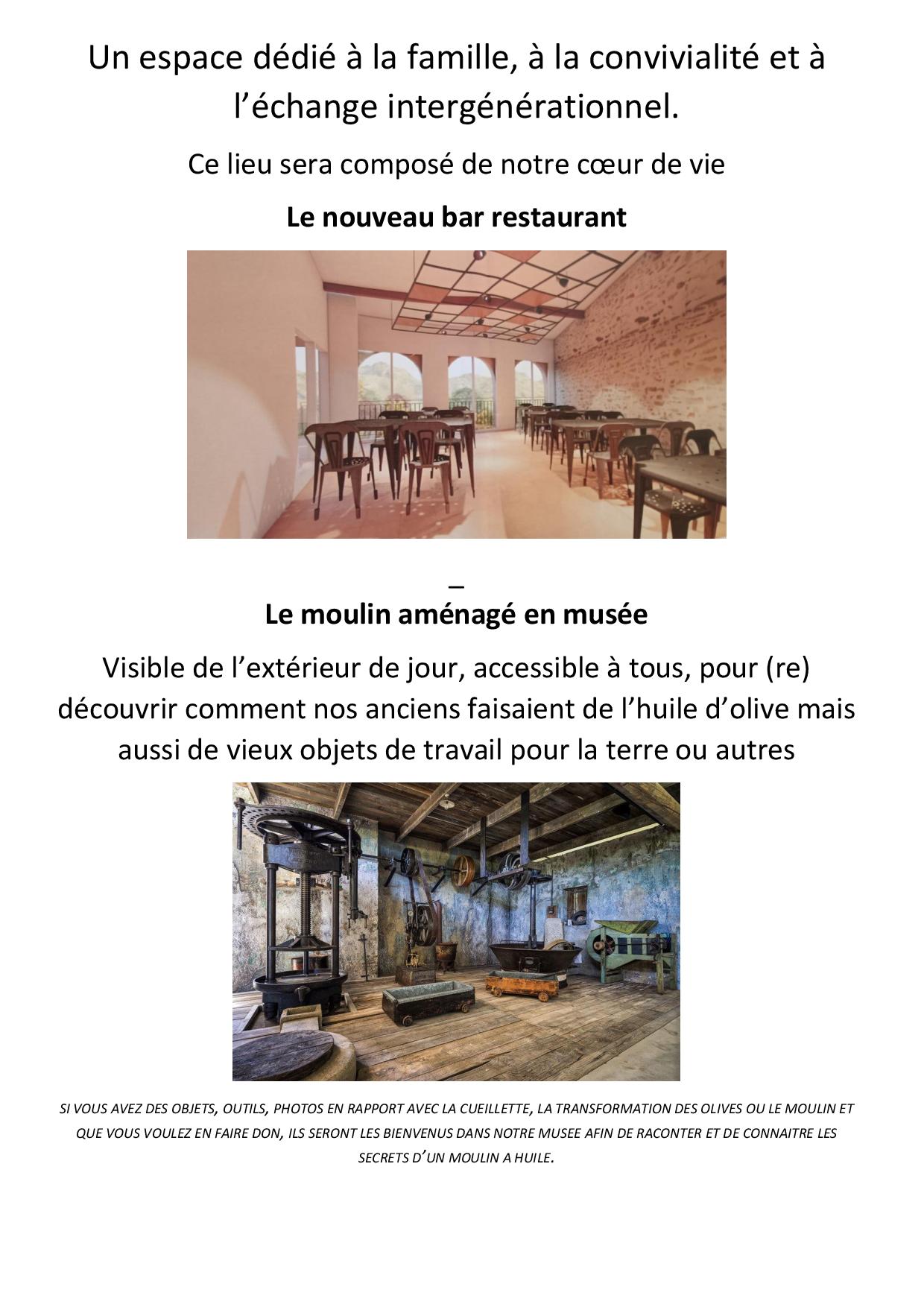 Parallèlement, nous avons récupéré le bas du moulin afin de lui redonner sa destination de musée et de mettre en avant la fabrication de l’huile d’Olives. Nous sommes donc dans l’attente de vos contributions et lègues pour que les générations puissent découvrir la fabrication (à l’ancienne) de l’huile d’olive mais également les outils pour la transformation du raisin en vin (Masse vin = Massoins).