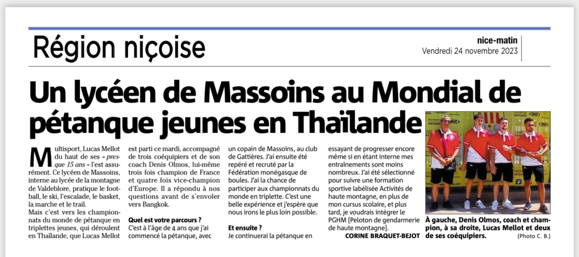 Agenda,Général,La communeMondial de Pétanque Jeunes en Thaïlande : Massoins croise les doigts pour LUCAS Publié le 24 novembre 2023 par Sylvie COLOMBON Compte rendu de la présentation de l’ABC 3ème place à la Coupe des Nations