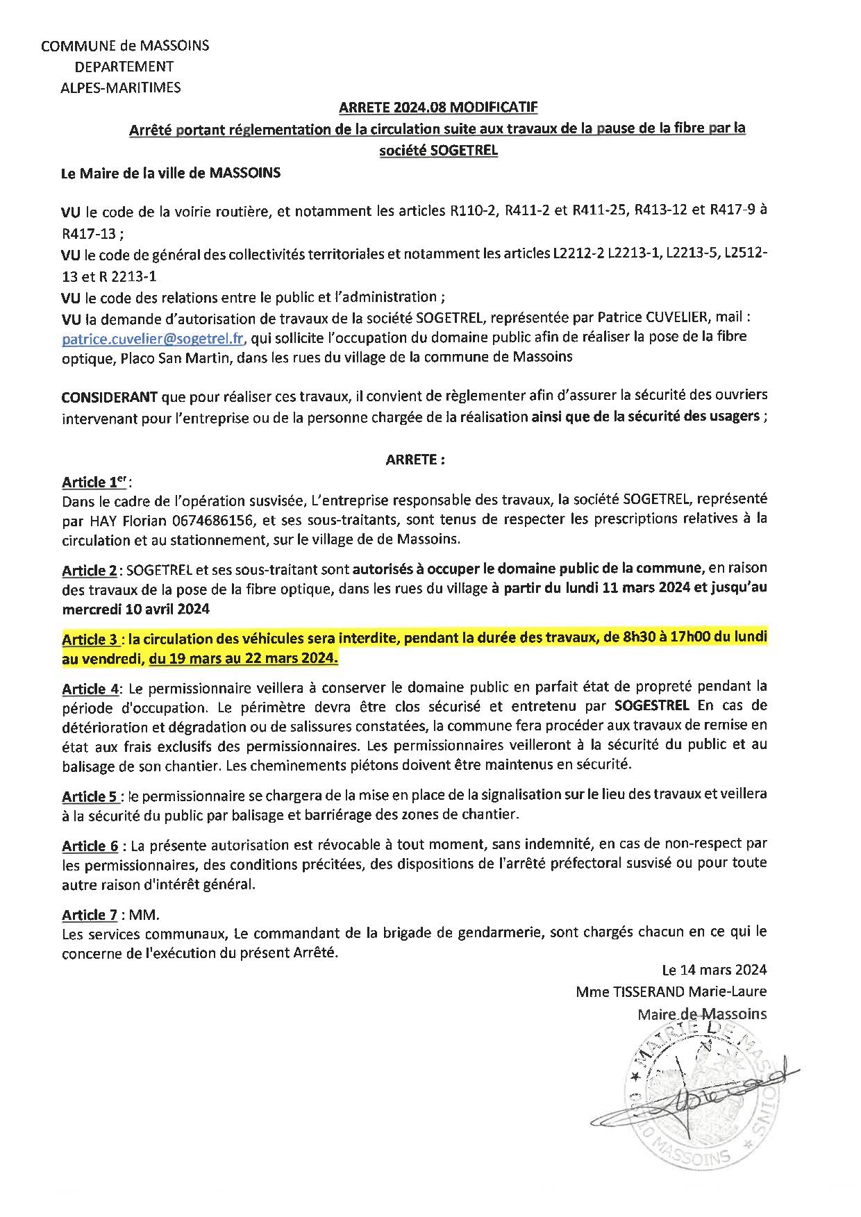 Afin de finaliser la pause de la fibre par la Société SEGETREL dans les rues du village, la circulation dans la Rue principale sera interdite :