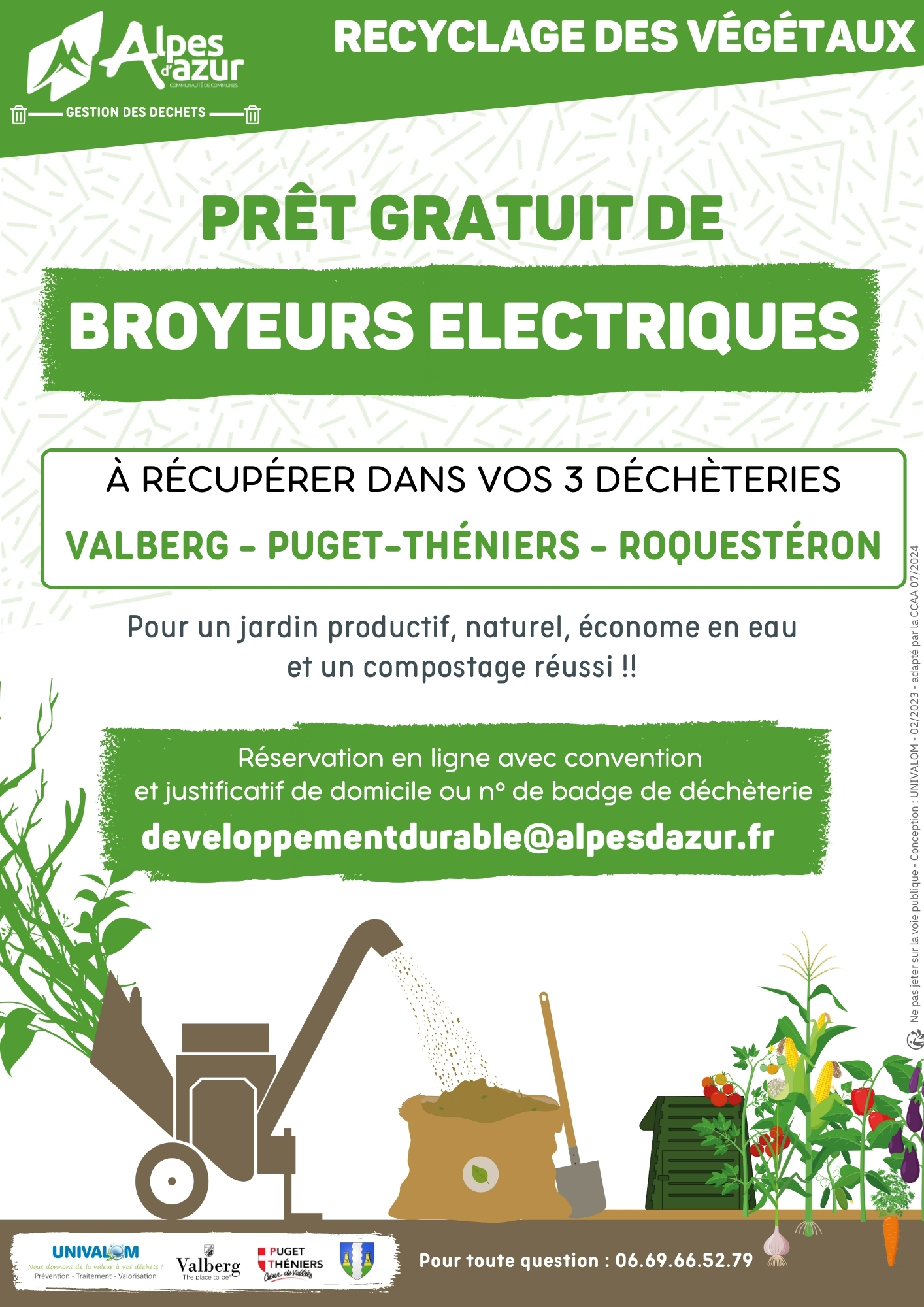 En complément des opérations de broyage de végétaux, la Communauté de Communes Alpes d’Azur, en partenariat avec son syndicat de traitement des déchets UNIVALOM, met gratuitement à disposition des administrés et des communes, des broyeurs électriques de petite capacité à compter de ce jour.