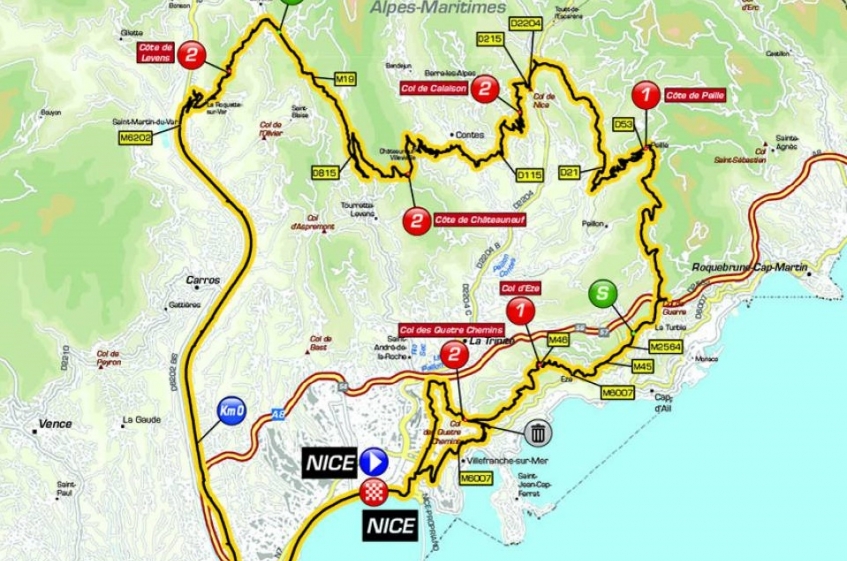 la vallée du Var sera fermée (RM 6202) depuis la Promenade des Anglais puis la vallée de la Vésubie (RM 2565 – Lantosque), la RM 73 et RD 2566 jusqu’à L’Escarène via Lucéram, RD 21 et 53 jusqu’à La Turbie, les RM 45 et 6007 jusqu’à Nice via Villefranche-sur-Mer de 13h45 jusqu’au passage de la voiture de fin de course.