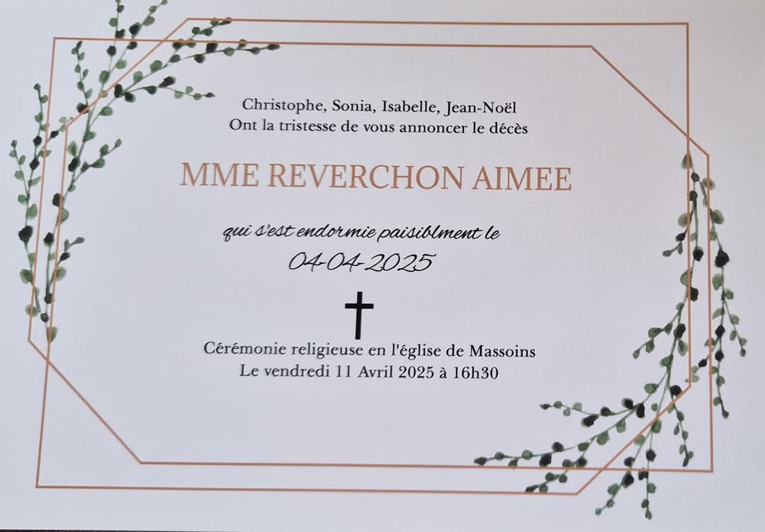 Nous sommes au regret de vous informer du décès de Madame Aimée REVERCHON, vendredi 4 avril.