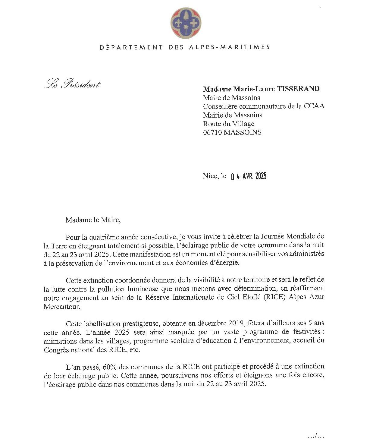 ABC Biodiversité,Agenda,Département des Alpes-Maritimes,Général,La commune3ème édition de la Journée Mondiale de la Terre Publié le 20 avril 202522 avril 2025 par Sylvie COLOMBON ATTENTION EXTINCTION DES ECLAIRAGES PUBLIC POUR LA NUIT DE LA TERRE Dès minuit vous pourrez profiter d’une pluie d’étoiles filantes des Lyrides SAMEDI 26 AVRIL Fleurissons le village ensemble Fermetures du secrétariat de Mairie