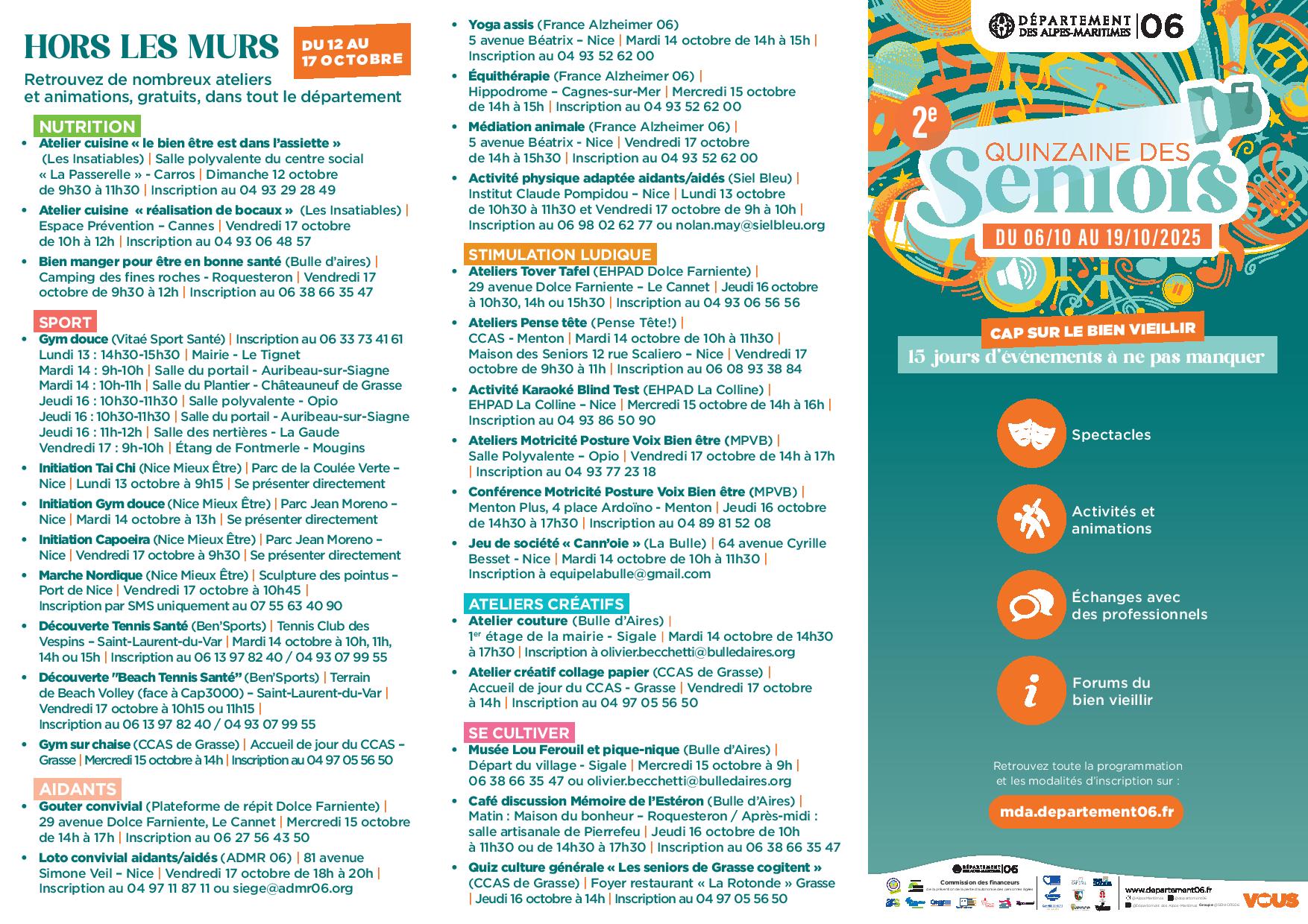 – Retrouvez de nombreux ateliers et animations, gratuits, dans le domaine de la nutrition, du sport, de la culture, de la stimulation ludique, des aidants et des ateliers créatifs.