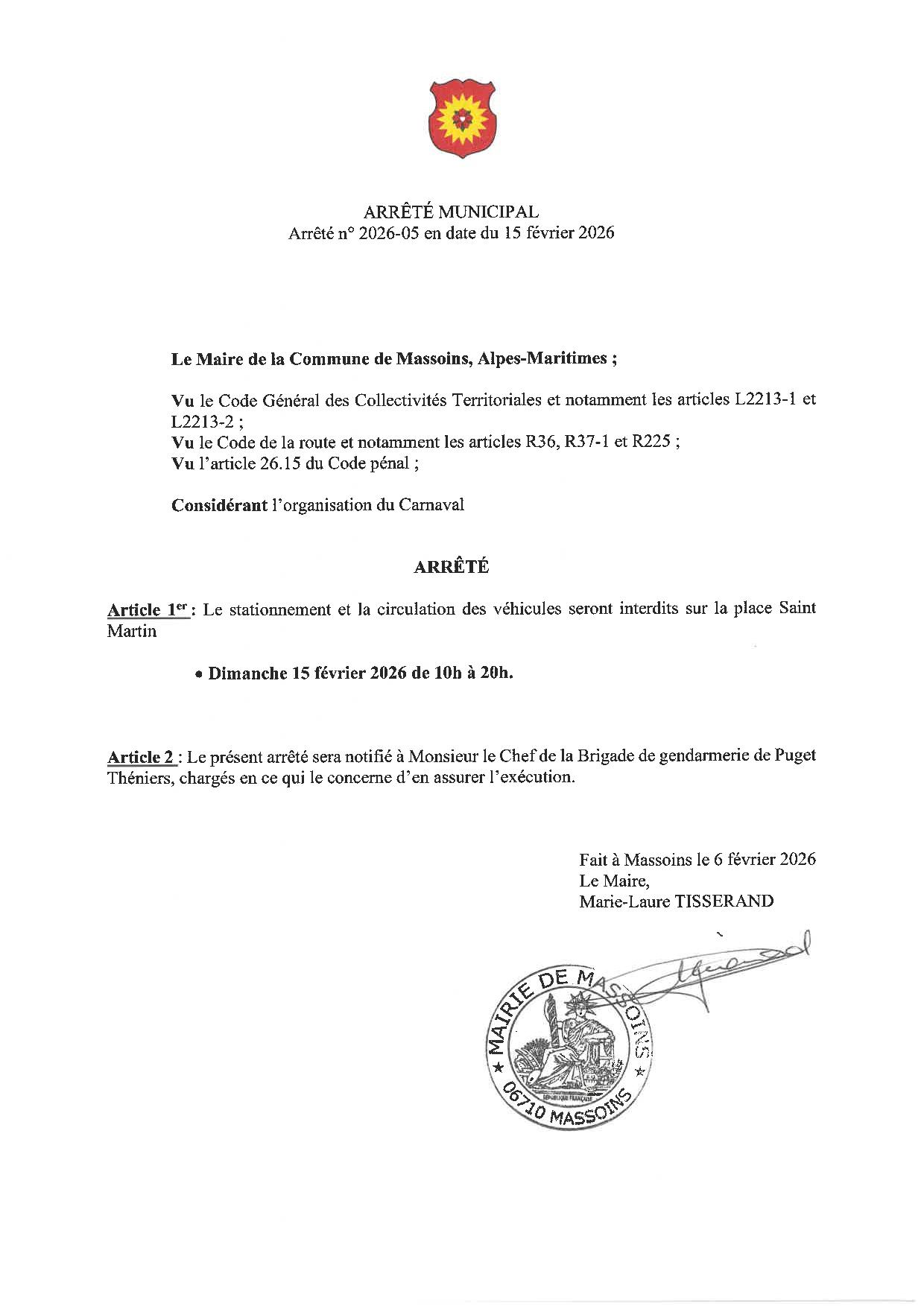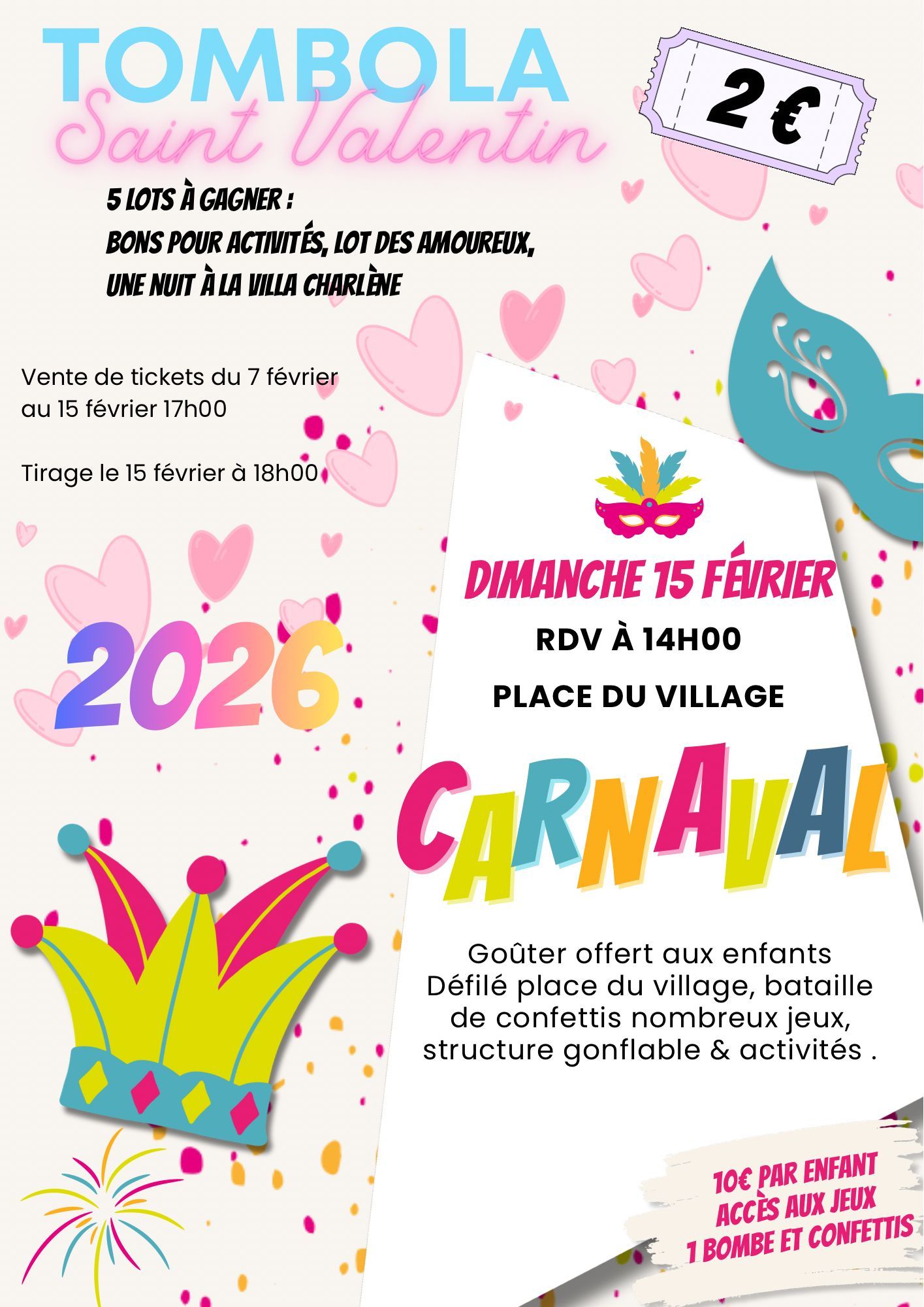 A la demande du Comité des Loisirs, afin d’organiser le Carnaval 2026, le stationnement est interdit ce dimanche 15 février de 10h à 20h sur la place. Cet arrêté est affiché depuis 1 semaine sur le domaine public concerné à l’entrée et à la sortie du village.