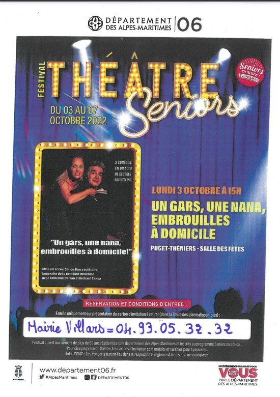 Agenda,CCAS,Général,La communeTHEATRE A PUGET THENIERS LUNDI 3 OCTOBRE A 15H Publié le 8 septembre 20228 septembre 2022 par Sylvie COLOMBON INSCRIVEZ-VOUS VITE AUPRES DE LA MAIRIE DE VILLARS SUR VAR AU 04.93.05.32.32 OU AUPRES DE Muriel Locchi Evénement Sportif à Villars sur Var Rencontre à Massoins autour des Activités Physiques Adaptées