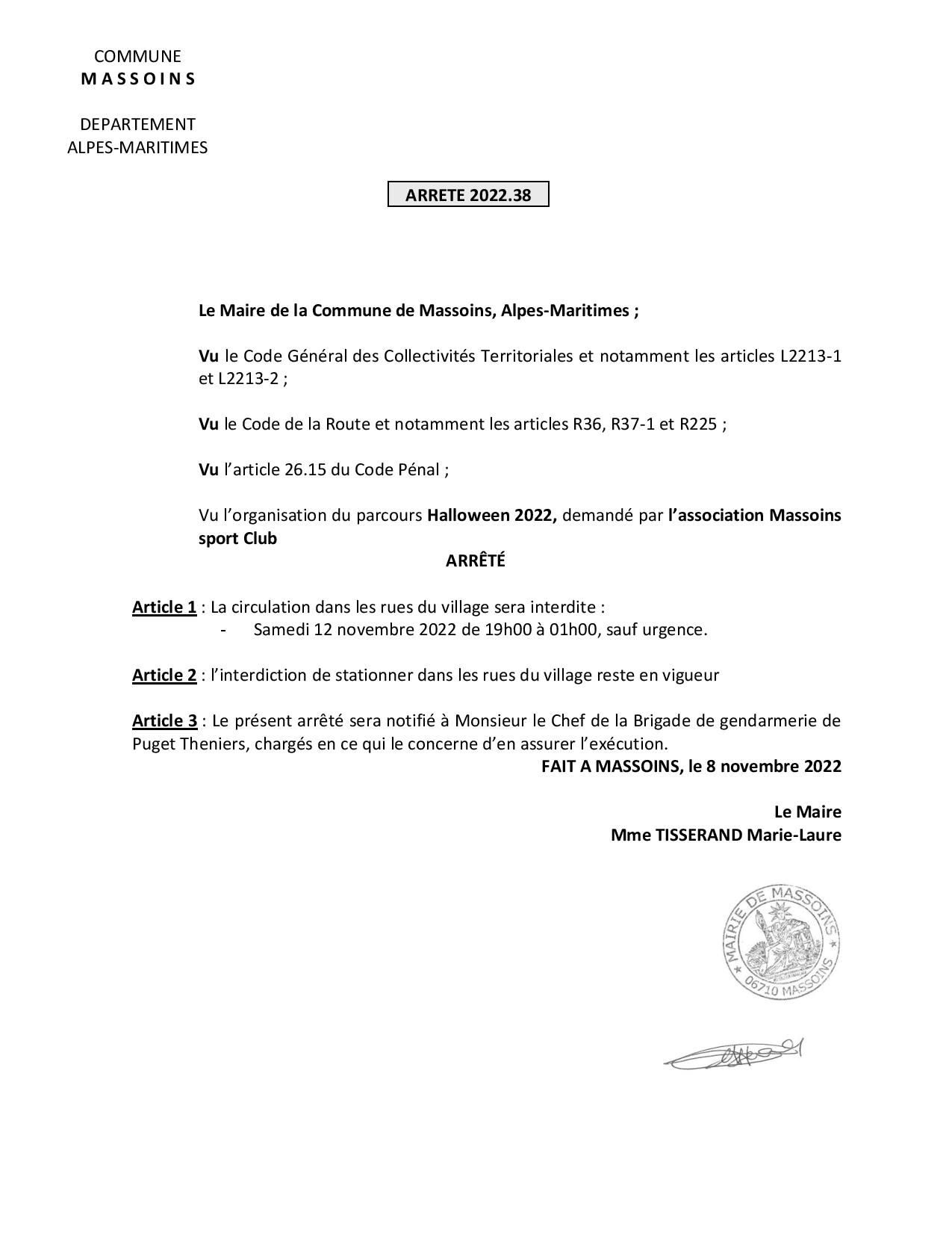 Afin de permettre à l’Association Massoins Sport Club d’organiser en toute sécurité son parcours hanté d’Halloween dans les rues et ruelles du village, la circulation est interdite (SAUF URGENCE) comme détaillé dans l’arrêté ci-dessous.