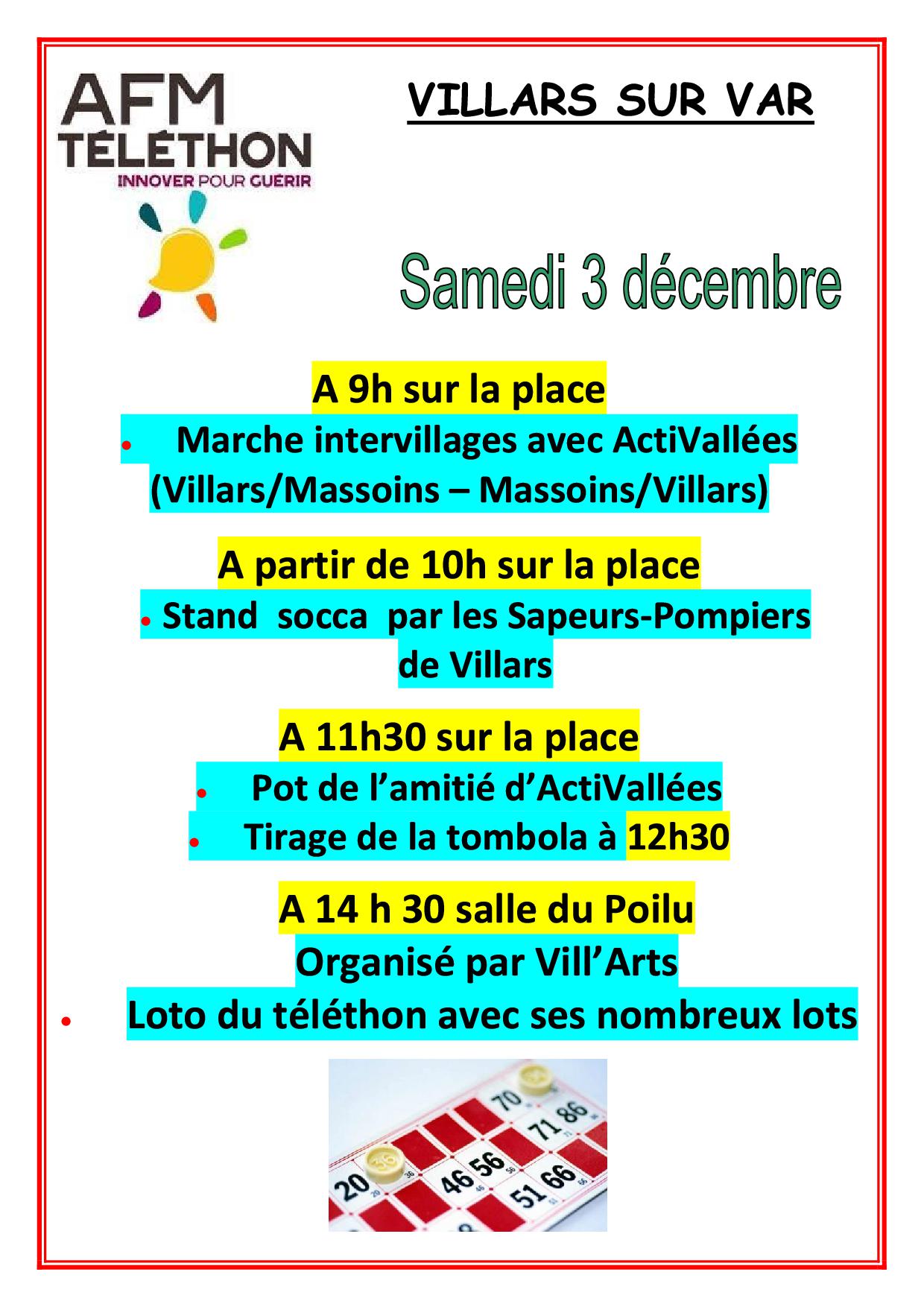 Agenda,Général,La communeTELETHON A VILLARS SUR VAR Publié le 28 novembre 202228 novembre 2022 par Sylvie COLOMBON Samedi 3 Décembre 2022 les Associations Villaroises se mobilisent, On compte sur vous! Opération Nationale d’Abandon d’Armes à l’Etat ATELIER INFORMATIQUE