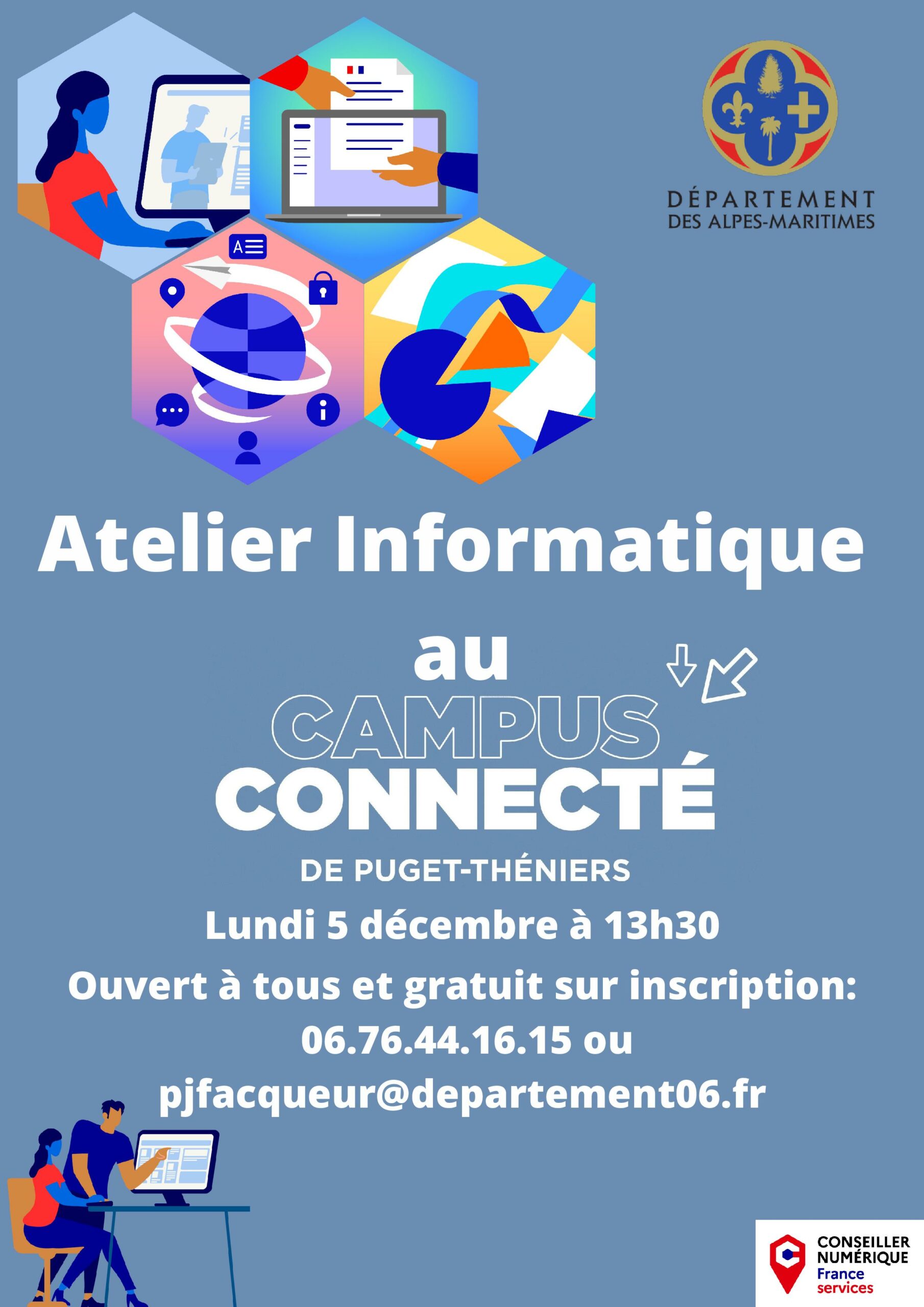 Lundi prochain le 5 décembre, aura lieu un atelier d’informatique au Campus Connecté à Puget Théniers (En lieu et place du Trésor Public après la station TOTAL).