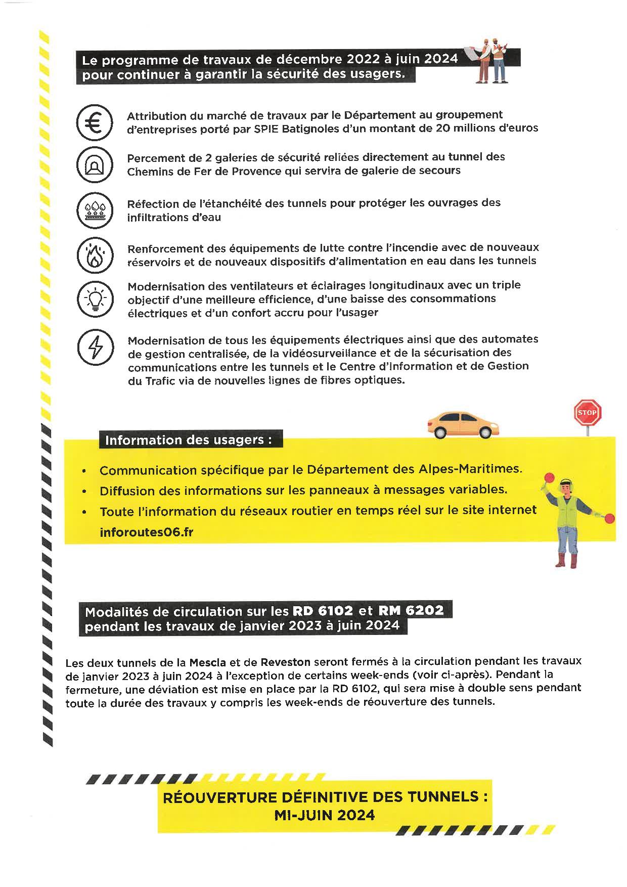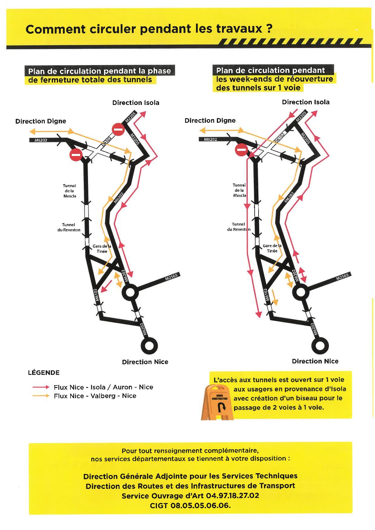 Voici les modalités de circulation sur les RD 6102 et RM 6202. Les deux tunnels (la Mescla et Reveston) seront fermés à la circulation pendant les travaux